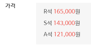좌석은 3가지가 있으며 좌석 별 가격은 아래 표와 같습니다.