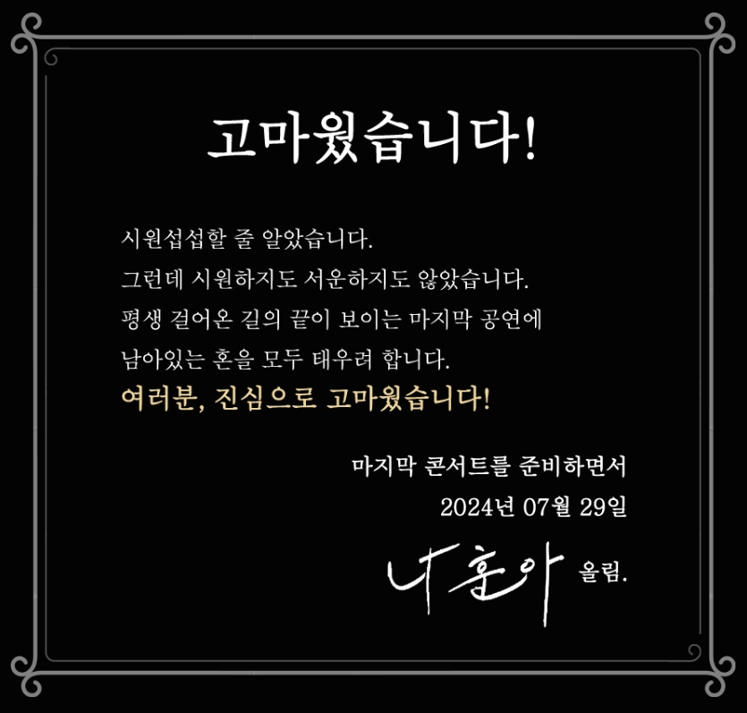 이번 콘서트는 그의 수많은 히트곡들을 다시 한번 무대에서 선보이며, 팬들과의 마지막 인사를 나누는 특별한 자리가 될 것입니다. 오랜 시간 동안 변함없이 사랑받아 온 그의 노래들이 라이브로 펼쳐질 이 콘서트는 한국 음악사에 길이 남을 이벤트가 될 것입니다.