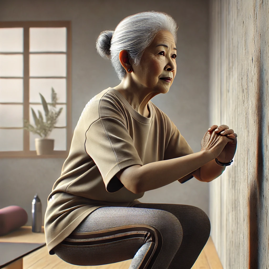 • 운동 방법: 벽에 등을 대고 서서 무릎을 90도로 구부린 채로 앉은 자세를 유지합니다. 이 자세를 10~30초간 유지합니다. 반복 횟수는 체력에 따라 조절할 수 있습니다.